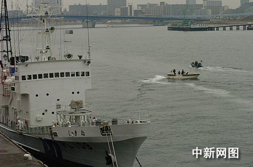 28日當?shù)貢r間上午8點半,距離中國海軍“深圳”號導(dǎo)彈驅(qū)逐艦的到來還有大約一個半小時。東京晴海碼頭已聚集了大量日本警察及中、日等國的記者。圖為在日本海上保安廳的船只和人員在晴海碼頭附近等待“深圳”號。作者:朱沿華