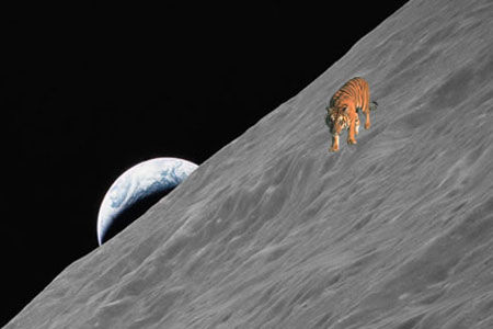 一個(gè)頭腦機(jī)靈的網(wǎng)民把華南虎“調(diào)”到月球上。利用電腦合成軟件,他把老虎照和月亮成像照合成在一起,上寫說(shuō)明云:“嫦娥一號(hào)發(fā)回首張照片,月球上發(fā)現(xiàn)華南虎一只,專家正在對(duì)照片真假做鑒定,預(yù)計(jì)結(jié)果將會(huì)在中國(guó)人登月后公布(大約2020年)!