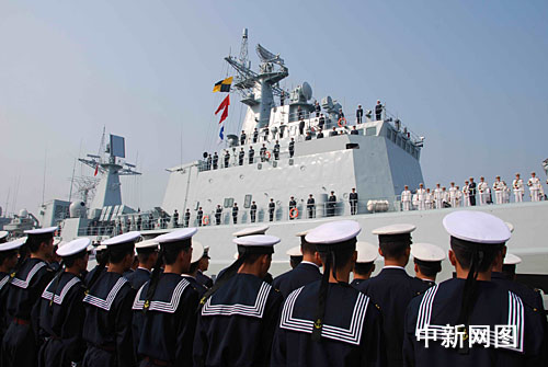 中國海軍副政委鄔華揚、廣州軍區(qū)副司令兼南海艦隊司顧文根等和數(shù)百名海軍官兵專程到碼頭迎接“深圳”艦凱旋。