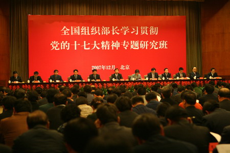 中新網(wǎng)12月14日電  據(jù)中國人事報報道,中國全國組織部長學(xué)習(xí)貫徹黨的十七大精神研究班12月9日至11日在京舉行。中共中央政治局委員、書記處書記、中央組織部部長李源潮與全體研究班學(xué)員座談交流并發(fā)表講話強調(diào),組織系統(tǒng)要深入學(xué)習(xí)十七大提出的新思想,落實十七大提出的新舉措,樹立十七大要求的新形象,努力做學(xué)習(xí)貫徹十七大精神的模范。