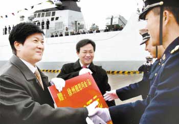 1月27日,海軍東海艦隊(duì)某軍港彩旗招展,軍樂激揚(yáng),一艘新型戰(zhàn)艦懸掛滿旗,威武莊嚴(yán),海軍“徐州艦”入列命名授旗儀式在這里隆重舉行。南京軍區(qū)副政委兼海軍東海艦隊(duì)政委徐建中中將,海軍東海艦隊(duì)參謀長王志國少將、政治部主任高長清少將,駐舟山部隊(duì)首長包裕平、劉蘇閩少將,舟山市領(lǐng)導(dǎo)鐘達(dá)、周偉江,我市領(lǐng)導(dǎo)曹新平、王昊等出席入列命名授旗儀式。