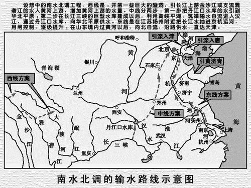 南水北調(diào)工程輸水示意圖。西線:開鑿一些巨大的隧洞,引長(zhǎng)江上游金沙江或支流雅礱江的水入黃河上游,增加黃河上游的水量。中線分兩步:第一步把丹江口水庫的水引到華北平原;第二步在長(zhǎng)江三峽的巨型水庫建成以后,利用高峽平湖,筑渠輸水自流進(jìn)入漢江,通過丹江口水庫,向華北平原供水。東線:在江蘇揚(yáng)州附近把長(zhǎng)江水抽進(jìn)京杭運(yùn)河,用閘控制,逐級(jí)提升;在山東境內(nèi)過黃河以后,向北自流,沿路供水,直達(dá)天津。
