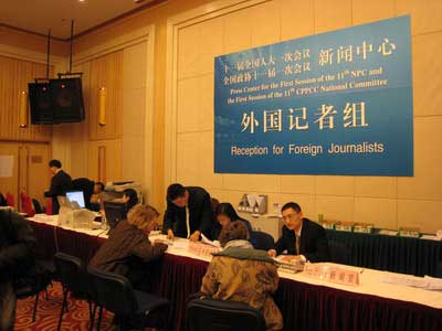 在記者的接待和安排方面,今年全國(guó)兩會(huì)在借鑒以前中共十七大期間一些好的做法的基礎(chǔ)上,還為中外記者推出了免費(fèi)上網(wǎng),免費(fèi)提供有關(guān)中國(guó)的圖書資料以及咖啡和餐點(diǎn)等一系列的貼心“服務(wù)”。祝壽臣介紹說:“這屆的兩會(huì)新聞中心借鑒了十七大一些好的做法,當(dāng)然同時(shí)也繼承了過去兩會(huì)新聞中心的一些好做法,增加了很多新的服務(wù)項(xiàng)目。比如第一次免費(fèi)提供中央人民廣播電臺(tái),中央電視臺(tái)的信號(hào),第一次免費(fèi)向記者提供新華社的適時(shí)新聞圖片,第一次免費(fèi)向記者提供寬帶上網(wǎng)服務(wù),同時(shí)我們還免費(fèi)向記者提供咖啡和茶點(diǎn)服務(wù)。此外,這次兩會(huì)還提供了很多圖書資料,有中國(guó)政治經(jīng)濟(jì)各方面的情況介紹,還有一些專題資料,資料種類大概有100多種,資料擺上來以后很快就被中外記者搶空了!