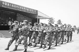 今天(26日)上午10時(shí)整,在地中海畔中國工兵營舉行的授勛儀式上,聯(lián)合國授予了中國第三批赴黎巴嫩維和部隊(duì)343名官兵“和平勛章”。