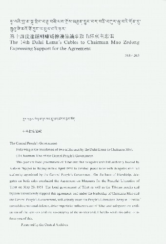 1951年5月,中華人民共和國中央人民政府和西藏地方政府簽訂了《關(guān)于和平解放西藏辦法的協(xié)議》。同年10月,達賴喇嘛致電毛澤東主席,擁護協(xié)議。在這份第十四世達賴喇嘛為擁護協(xié)議事致毛澤東主席的電報中,達賴喇嘛明確表示要“在毛主席及中央政府領(lǐng)導(dǎo)下”“保護祖國領(lǐng)土主權(quán)的統(tǒng)一”。這份電報全文如下: