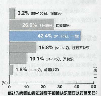 心態(tài)指人們對(duì)待事物的心理態(tài)度,是人的心理對(duì)各種信息刺激做出反應(yīng)的趨向。心態(tài)構(gòu)成情緒,心態(tài)反映認(rèn)知,心態(tài)決定行為。良好的心態(tài)必然產(chǎn)生快樂(lè)感、幸福感和滿意感,良好的心態(tài)也有助于提高人的工作效率和生活質(zhì)量,更有益于人的健康。此次調(diào)查顯示,大多數(shù)中青年干部給自己目前的工作、生活狀況打了較高分。就整體而言,在回答“若以百分制打分的話,您認(rèn)為我國(guó)中青年領(lǐng)導(dǎo)干部的快樂(lè)感可打多少分?”時(shí),有72.2%的人選擇了61分以上。(見(jiàn)表一)在個(gè)人層面,有50.4%的受訪者“對(duì)自己目前工作狀況的滿意度”給出了71分以上的高分,處于“很快樂(lè)”和“比較快樂(lè)”的心理狀態(tài),加上選擇61分~70分即“一般快樂(lè)”的28.8%,總計(jì)占了79.2%。(見(jiàn)表二)有60.7%的受訪者“對(duì)自己目前生活狀況的滿意度”給出了71以上的高分,處于“很滿意”和“比較滿意”的心理狀態(tài),加上選擇61分~70分即“一般滿意”的25.6%,總計(jì)達(dá)到了80.3%。(見(jiàn)表三)上述結(jié)果表明,大多數(shù)中青年干部心態(tài)良好,但極少數(shù)人表達(dá)出來(lái)的不快樂(lè)、不滿意傾向也不容忽視,這一傾向往往是構(gòu)成心理和行為問(wèn)題的潛在因素。