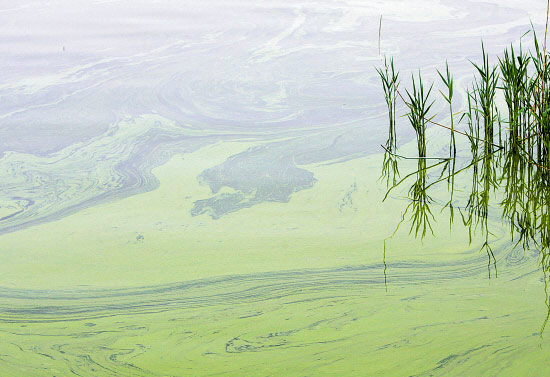 雖然經(jīng)過(guò)多日雨水的稀釋,但前日陽(yáng)光下,湖州南太湖邊的水面上,一層綠膜仍泛著油光!斑@些就是藍(lán)藻!币晃粷O民告訴記者。