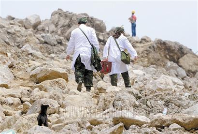 昨日下午2時(shí)許,本報(bào)記者一行人經(jīng)過(guò)3個(gè)小時(shí)徒步行軍,抵達(dá)一個(gè)叫山邊坪的地方,這里是成都軍區(qū)空軍的臨時(shí)駐地,距離銀廠溝溝口不足四公里。一個(gè)幾乎被地震摧毀的農(nóng)家樂(lè)旁,部隊(duì)?wèi)?zhàn)士正在埋鍋?zhàn)鲲垼恍⿷?zhàn)士拖著疲憊的雙腿,扛著鐵鍬等工具往下撤退;一些戰(zhàn)士正在就地掩埋尸體。營(yíng)地旁邊的臨時(shí)停機(jī)坪,直升機(jī)從溝下轟鳴著而來(lái),不時(shí)降落此地。