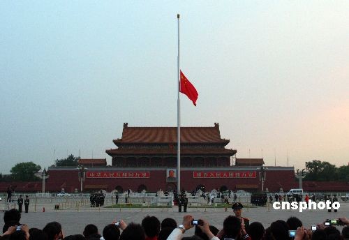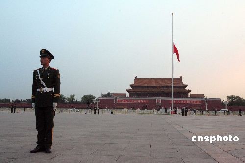中新網(wǎng)北京5月19日電 五月十九日凌晨四時(shí)五十七分四十秒,北京天安門(mén)廣場(chǎng)下半旗,沉痛哀悼在汶川特大地震中的遇難者。