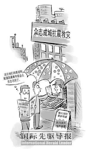 國(guó)際先驅(qū)導(dǎo)報(bào)文章 中國(guó)發(fā)生“5·12”汶川大地震之后,西方媒體給予了大量積極正面的報(bào)道。一直以來(lái)認(rèn)為“中國(guó)媒體不可信”的西方媒體,比如CNN、BBC等,在此次地震報(bào)道中都大量使用了中國(guó)媒體的電視畫面和文字報(bào)道,這十分少見(jiàn)。與之前報(bào)道西藏“3·14事件”、“奧運(yùn)圣火傳遞”相比,西方媒體報(bào)道的態(tài)度來(lái)了個(gè)180度的大轉(zhuǎn)彎。即使有少量負(fù)面報(bào)道和批評(píng)聲音,但這些已經(jīng)讓西方讀者覺(jué)得不那么可信了。西方民眾、媒體評(píng)論人,總體上都正面評(píng)價(jià)中國(guó)政府組織的抗震救災(zāi),以及贊揚(yáng)中國(guó)人民在災(zāi)難面前表現(xiàn)出來(lái)的勇氣。
