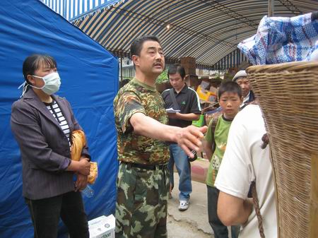 昨日,14歲的龍和平背著背簍,步行兩個(gè)多小時(shí),從擂鼓鎮(zhèn)河道村來(lái)到北川中學(xué),準(zhǔn)備背些吃食回去。王洪發(fā)急了:“你從擂鼓走十七八里到這里來(lái)干啥?沒(méi)車,你背不背得回去嘛?”王洪發(fā)不停地“批評(píng)”那個(gè)孩子:“擂鼓也可以領(lǐng)東西!迸c龍和平同來(lái)的河道村村民有10來(lái)個(gè)。站在物資分配警戒線外,王洪發(fā)不停地為大家解釋,民政局正在登記造冊(cè)。