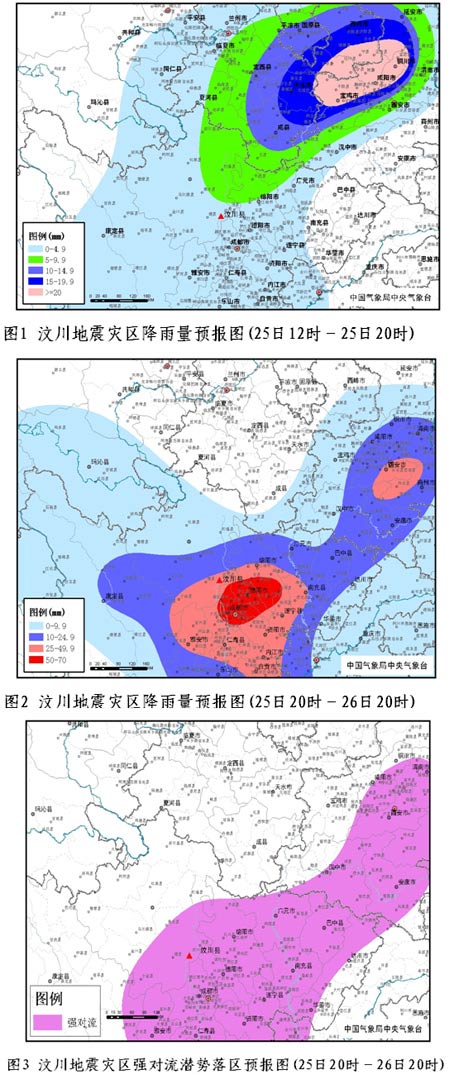25日夜間至26日白天,四川、甘肅南部、陜西南部等地震災(zāi)區(qū)將出現(xiàn)一次中到大雨、局地暴雨天氣,并伴有短時雷雨大風(fēng)等強對流天氣。四川北川(包括堰塞湖地區(qū))、理縣、汶川、都江堰、茂縣、綿竹的降雨量為20-60毫米,青川、廣元的降雨量為8-20毫米,甘肅文縣、陜西寧強和略陽的降雨量為3-10毫米,上述地區(qū)伴有短時雷雨大風(fēng)天氣,請注意采取帳篷的防風(fēng)防雷措施。