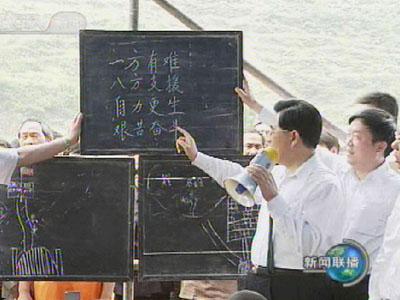 胡錦濤還拿起粉筆在小黑板上寫下十六個(gè)大字,“一方有難、八方支援、自力更生、艱苦奮斗”,寫完,胡錦濤領(lǐng)著孩子們一起大聲朗誦。