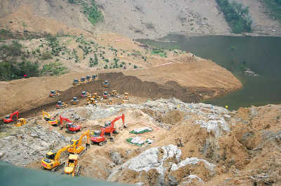 31日晚8時,記者在唐家山堰塞體一側的山坡上看到,一條土黃色的溝渠圍繞著堰塞體的左側,除了靠近堰塞湖處的泄流槽仍有兩臺挖掘機和兩臺推土機在施工外,現(xiàn)場其他的機械都已停工,并統(tǒng)一停放在一處高地上。