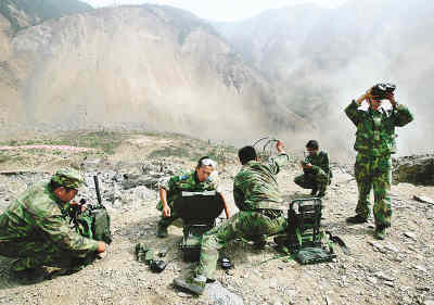 當(dāng)日16時(shí),擔(dān)負(fù)為直飛堰塞湖的飛機(jī)提供準(zhǔn)確氣象資料任務(wù)的成都軍區(qū)空軍氣象觀測(cè)小分隊(duì)向唐家山進(jìn)發(fā)。