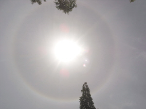 又訊 “不會又有事情發(fā)生吧?”、“不會,這是一個好兆頭!”昨日中午11時38分,記者到達青川縣城時,許多市民正仰天觀望,議論紛紛。有的市民稱,他們這輩子還是第一次見到這么大的日暈。記者抬頭發(fā)現(xiàn),在上空出現(xiàn)了一個巨大圓形,圍繞著太陽,最里面是一片灰色,外面依次是紅色、淺綠色和白色,這一現(xiàn)象持續(xù)了一個多小時才消失。