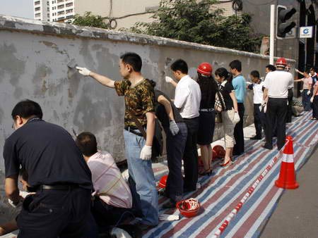6月3日清晨的成都市繁華中心鹽市口國(guó)際商場(chǎng)圍墻邊,成都錦江區(qū)四大班子領(lǐng)導(dǎo)、機(jī)關(guān)干部、各街道辦黨政主要負(fù)責(zé)人在區(qū)委書(shū)記周思源和區(qū)長(zhǎng)張濟(jì)環(huán)帶領(lǐng)下,正認(rèn)真地粉刷著圍墻。四川新聞網(wǎng)記者獲悉,作為清潔城市大行動(dòng)的一個(gè)部分,錦江區(qū)將根據(jù)創(chuàng)建成都市最清潔城區(qū)的目標(biāo),從即日起在全區(qū)范圍內(nèi)展開(kāi)粉刷圍墻行動(dòng)。