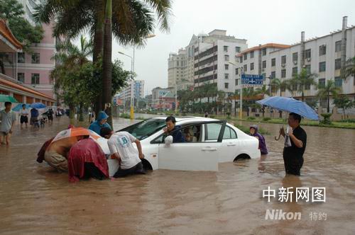 受高空槽和切變線共同影響,六月五日至六日,廣東茂名各地出現(xiàn)明顯強(qiáng)降水過程,全市日降雨量均值八十五毫米。由于降雨量大且強(qiáng),致使茂名市局部地區(qū)出現(xiàn)洪澇和山體滑坡災(zāi)害,并導(dǎo)致高州古丁鎮(zhèn)一名九歲男學(xué)生及一名十四歲女學(xué)生失蹤。據(jù)統(tǒng)計(jì),這次暴雨成災(zāi),茂名全市有六個(gè)縣區(qū)八十一個(gè)鎮(zhèn)約六十萬人受災(zāi),倒塌房屋近千間,直接經(jīng)濟(jì)總損失二億元人民幣。圖為茂名市區(qū)幾成澤國。 中新社發(fā) 梁盛 攝