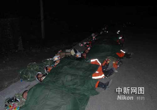 圖為在地震災區(qū)艱苦條件下風餐露宿的山東消防官兵。(作 者:魯泰霄)