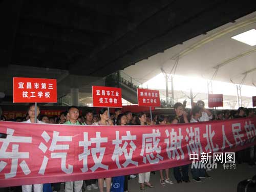 “我們都是你親人”、“熱列歡迎新同學”、“鄂川人民心連心”,7日的武昌火車站一號站臺,前來迎接這批學生的湖北技工院校師生高舉溫情的標語。每個學校還專門安排了迎接接收學生的校車,并整齊地停在站臺上。當四川技校生一踏上車站,即刻被站臺上熱情的人們所包圍。來自湖北各地的技工院校,將災區(qū)學生分別有秩序地帶領到各自對口接收學校的校牌下集中,排成整齊的隊伍,并點名清點人數。