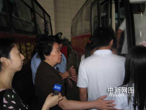 湖北省副省長張岱梨(左二)送災區(qū)學生上車。作者:艾啟平