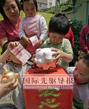 5月15日,天津和平區(qū)保育院的兒童帶著自己的存錢罐,向四川地震災(zāi)區(qū)捐獻自己的“積蓄”。劉海峰/攝