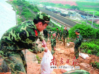 昨日一早,清遠(yuǎn)軍分區(qū)又緊急調(diào)集駐軍官兵和民兵300多人突擊搶險(xiǎn)。他們用防水布鋪蓋土坡面、在園區(qū)地面開挖臨時(shí)排水溝、清理鐵路渠涵、堆壓砂包固坡腳、修筑攔沙壩攔截滑坡的沙石。至發(fā)稿時(shí),搶險(xiǎn)工作共完成土石方1.5萬立方米,投入纖維包6萬只,防水布3萬平方米,木樁30立方米。昨日上午,武警清遠(yuǎn)市支隊(duì)緊急集中200名官兵,在滑坡路段筑起防滑隔離帶。昨晚,清遠(yuǎn)軍分區(qū)請(qǐng)示上級(jí)派清遠(yuǎn)駐軍某部300人前往支援。