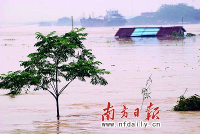 記者在鶯哥咀水文站附近看到,內河堤內的香蕉樹及其他一些防洪樹木,此刻全部被淹沒在洪水中,只露出樹梢在外面搖擺。在離水文站不遠處,一管樁廠也全部被洪水淹沒。一村民告訴記者,該廠的所有員工已于日前全部撤至安全地帶。