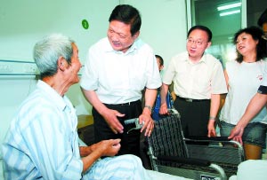 德陽市人民醫(yī)院收治了部分在地震中受傷的群眾。當聽說許多傷者接受了截肢手術(shù),劉淇在行前特意囑咐工作人員,購買了100部輪椅贈送給什邡人民。83歲的劉文友因受傷腿部截肢,劉淇俯下身把他攙到輪椅上,叮囑老人家好好休養(yǎng),爭取早日康復。北京市援建的什邡市社會福利中心建成兩周,已經(jīng)接收了近百名孤老,面對北京市領導,吳定安老人泣不成聲,他的兩個兒子,都在地震中遇難。劉淇安慰老人,福利院就是你的家,北京人都是你的親人。