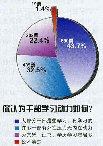 本次調查結果顯示,干部在工作中的感受,58.3%的受調查者認為尚能應對,能力與新任務與時俱進,31.5%的受調查者表示緊張,壓力大,有精力透支現(xiàn)象。而在“本單位的干部選拔任用、職務/職稱晉升中,下列哪些因素的作用影響最大?”的問卷調查結果顯示出,排在前三位的是:工作能力(占總73.5%)、群眾關系(占總68.2%)、領導關系(占總63.4%)。相當部分的干部認為能力已能應付工作,這也就部分地解釋了干部學習動力不足的原因。