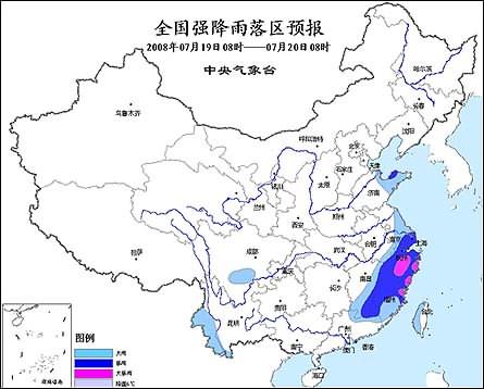 中新網(wǎng)7月19日電 中央氣象臺(tái)2008年7月19日06時(shí)繼續(xù)發(fā)布暴雨橙色警報(bào):預(yù)計(jì)今天白天到夜間,福建大部、浙江、廣東東北部、江西南部和東部、江蘇南部、上海以及山東半島等地有暴雨,其中,福建北部、浙江中南部等地的部分地區(qū)有大暴雨。