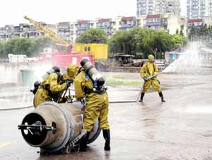 一艘裝載200噸鹽酸的貨船在淀浦河港池碼頭卸貨時(shí)發(fā)生“泄漏”,濃度為35%的鹽酸從傳導(dǎo)壓力鋼管的裂縫處大量噴出,辛辣的氣味造成附近一公里范圍內(nèi)的群眾口鼻干燥難忍,氣短胸悶。這是日前徐匯區(qū)在淀浦河沿岸開(kāi)展環(huán)境污染事故應(yīng)急處置演練的一幕場(chǎng)景,也是上海中心城區(qū)首次進(jìn)行的大規(guī)模防化學(xué)污染演練。