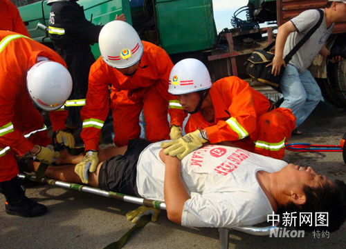 大橋消防中隊(duì)接到報(bào)警后,立即出動(dòng)三輛消防車15名消防官兵趕赴出事地點(diǎn)。8時(shí)36分到達(dá)事故現(xiàn)場,此時(shí),空氣中彌漫著濃濃的柴油、機(jī)油味道,發(fā)動(dòng)機(jī)處還向外冒著黑煙。指揮員迅速展開災(zāi)情偵察,組織搶險(xiǎn)車人員利用液壓破拆器材解救被困人員,A類泡沫車人員出兩支泡沫槍滅火掩護(hù),重型水罐泡沫車組織供水。動(dòng)作迅速,操作熟練的消防官兵只用了5分鐘的時(shí)間就成功將駕駛員救出,并在第一時(shí)間抬上救護(hù)車送往醫(yī)院。