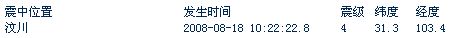據(jù)地震臺(tái)網(wǎng)測(cè)定,北京時(shí)間8月18日10時(shí)22分,在汶川(北緯31.3,東經(jīng)103.4) 發(fā)生4.0級(jí)地震。