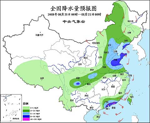 2008年8月21日8時(shí)—8月22日8時(shí)全國降水量預(yù)報(bào)圖
