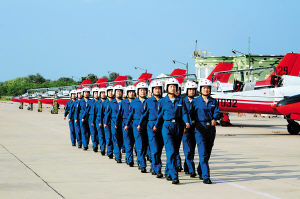 銀白色頭盔,天藍色飛行服,在紅白相間的戰(zhàn)鷹映襯下,整裝待發(fā)的女飛行學員顯得英姿颯爽!伴_車!”隨著指揮員、飛行大隊長孫光輝一聲令下,剎那間,發(fā)動機轟鳴震天撼地,戰(zhàn)鷹依次滑進跑道,以雷霆萬鈞之勢直沖云天。