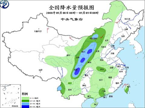 2008年9月8日8時-9日8時全國降水量預(yù)報圖