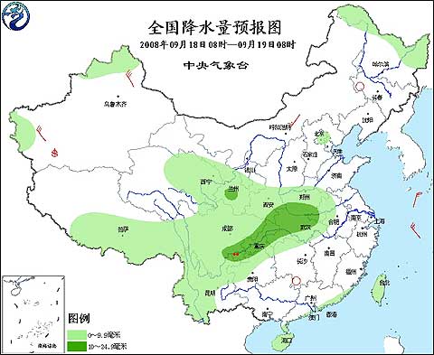2008年9月18日8時—9月19日8時全國降水量預(yù)報圖