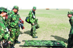 “神七”醫(yī)療救護(hù)隊(duì)在主著陸場(chǎng)附近集結(jié)進(jìn)行有針對(duì)性的救護(hù)演練。