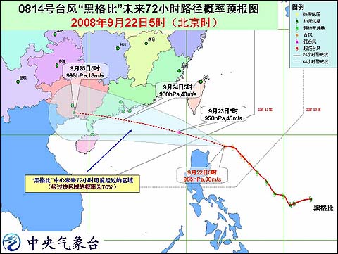 中新網(wǎng)9月22日電 據(jù)問天網(wǎng)消息,中央氣象臺今天早晨六時發(fā)布臺風消息:今年第14號臺風“黑格比”(HAGUPIT)的中心今天早晨5時其位于我國臺灣省恒春市東南方大約490公里的西北太平洋洋面上,就是北緯18.9度,東經(jīng)124.0度,中心附近最大風力有13級(38米/秒)。