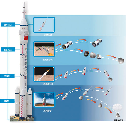 從火箭發(fā)射前30分鐘到起飛后120秒、飛行高度在39千米時逃逸塔分離,以及從120秒到200秒左右、飛行高度115千米時整流罩分離這兩個時間空間段內(nèi),萬一發(fā)生意外緊急狀況時,逃逸塔就會啟動,靠固體燃料火箭發(fā)動機提供巨大的瞬間推力,將航天員所在的飛船從火箭上拉出來,帶著航天員偏離火箭的運行軌道,逃離險境,然后借助降落傘和緩沖裝置安全降落到地面。由于增加了逃逸系統(tǒng),長征二號F火箭的安全性指標(biāo)由過去發(fā)射100次可能出現(xiàn)3次危及航天員生命的問題,減少到現(xiàn)在發(fā)射1000次才可能發(fā)生3次這樣的事故,達到了國際先進水平。