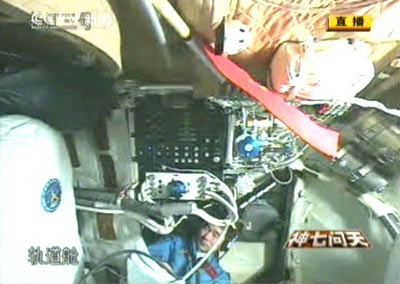劉伯明在飛船軌道艙進行軌道艙狀態(tài)檢查和艙外航天服的組裝與測試等工作。(電視截圖)