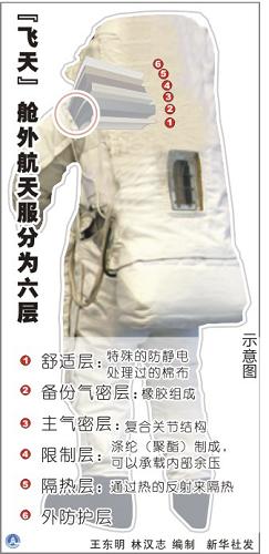 航天服的左臂上印著鮮紅的國旗,右臂上有兩個(gè)大字:“飛天”。航天服研究室主任劉向陽說,“飛天”是中國研制的第一代艙外航天服,整體設(shè)計(jì)和各部件的設(shè)計(jì)、組裝都是中國人自己完成的。就完成目前任務(wù)的能力而言,接近國際水平。