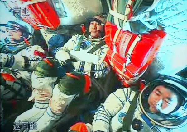 北京飛控中心指揮大廳大屏幕顯示,北京時(shí)間9月28日下午15時(shí)30分許,神舟七號(hào)飛船返回艙正在做環(huán)繞地球第45圈的旅行,三名航天員即將返回地球,此刻他們已經(jīng)穿好艙內(nèi)航天服,神態(tài)安詳平靜。 李非攝
