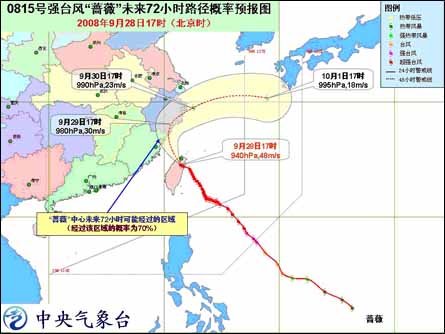 預(yù)計,未來數(shù)小時“薔薇”將在臺灣北部回旋少動,以后將以每小時15公里左右的速度向西北方向移動,今天夜間進入臺灣海峽北部海面。之后,將轉(zhuǎn)向偏北方向移動,強度逐漸減弱,將于明天白天登陸或擦過福建北部到浙江南部一帶沿海,也有可能在閩浙近海轉(zhuǎn)向東北方向移動。