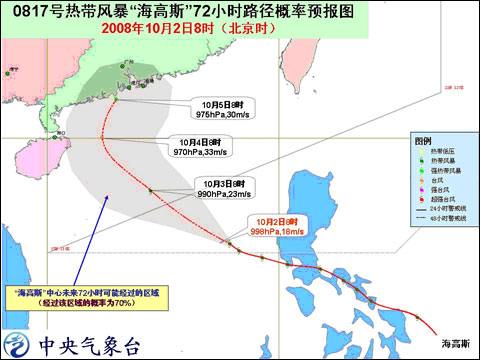 10月2日8時(shí)熱帶風(fēng)暴“海高斯”72小時(shí)路徑概率預(yù)報(bào)圖(中國天氣網(wǎng) 圖)