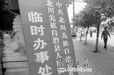 由于北川新縣城選址一直待定,北川縣委、縣政府的駐地在災后數(shù)易其址。從最初北川中學附近的帳篷,遷至北川擂鼓鎮(zhèn)的帳篷。期間,還曾在安昌鎮(zhèn)天龍賓館的大堂設立臨時辦事處?h里的各委、辦、局則擠在旁邊的一間火鍋店里,甚至“三個單位合用一個桌子”。后來化整為零?h級61個單位分散租用安昌鎮(zhèn)的民房作為辦公地兼集體宿舍。