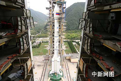 “委內(nèi)瑞拉一號”通信衛(wèi)星及“長征三號乙”運載火箭星箭組合體倚立于發(fā)射塔架之畔,蓄勢待發(fā)。作者:尹濤