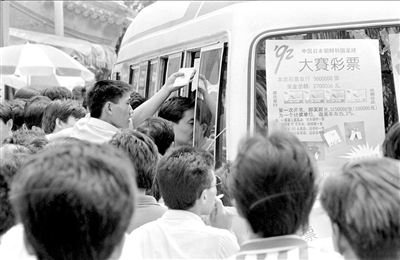 集中銷(xiāo)售彩票的模式開(kāi)展起來(lái)。當(dāng)時(shí),福彩、體彩的人拉著電視機(jī)、洗衣機(jī)、自行車(chē)等,到農(nóng)村的集市或者城市的廣場(chǎng)上售賣(mài)。人們管這種彩票叫“刮獎(jiǎng)”,買(mǎi)到后,只需用指甲刮開(kāi),便知道自己是中了自行車(chē)、洗衣機(jī),還是一無(wú)所獲。