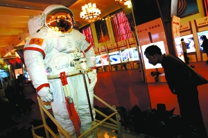 昨日,軍博展廳,觀眾在看“神七”艙外航天服!∮浾 浦峰 攝